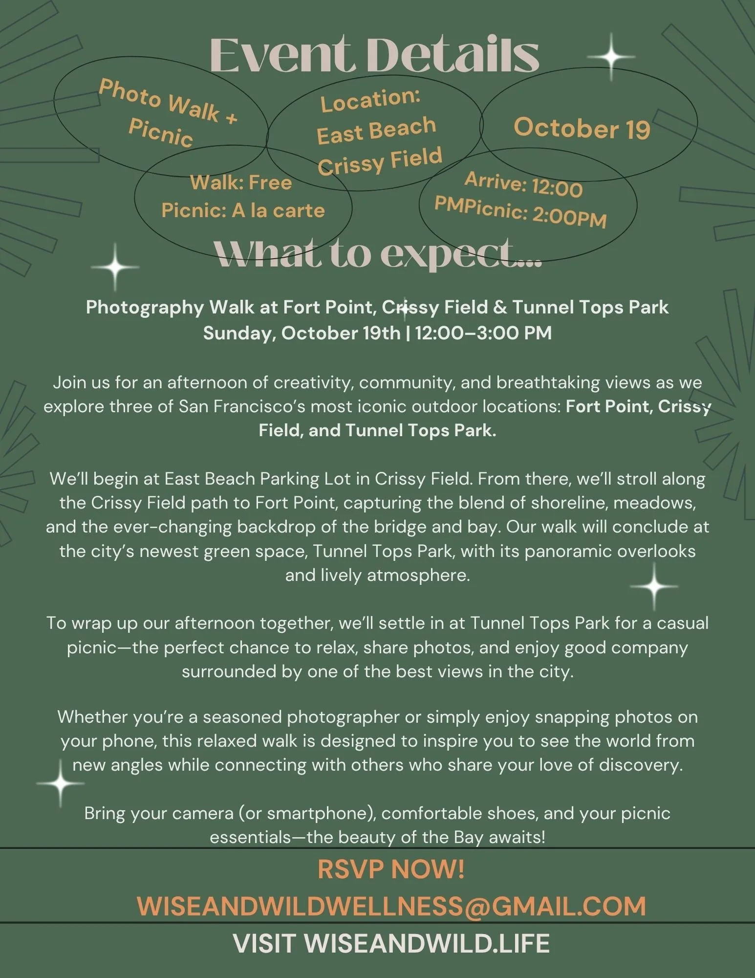 An afternoon of creativity, community, and breathtaking views as we explore three of San Francisco’s most iconic outdoor locations: Fort Point, Crissy Field, and Tunnel Tops Park. Whether you’re a seasoned photographer or simply enjoy snapping photos on your phone, this relaxed walk is designed to inspire you to see the world from new angles while connecting with others who share your love of discovery. Bring your camera (or smartphone), comfortable shoes, and your picnic essentials—the beauty of the Bay awaits!