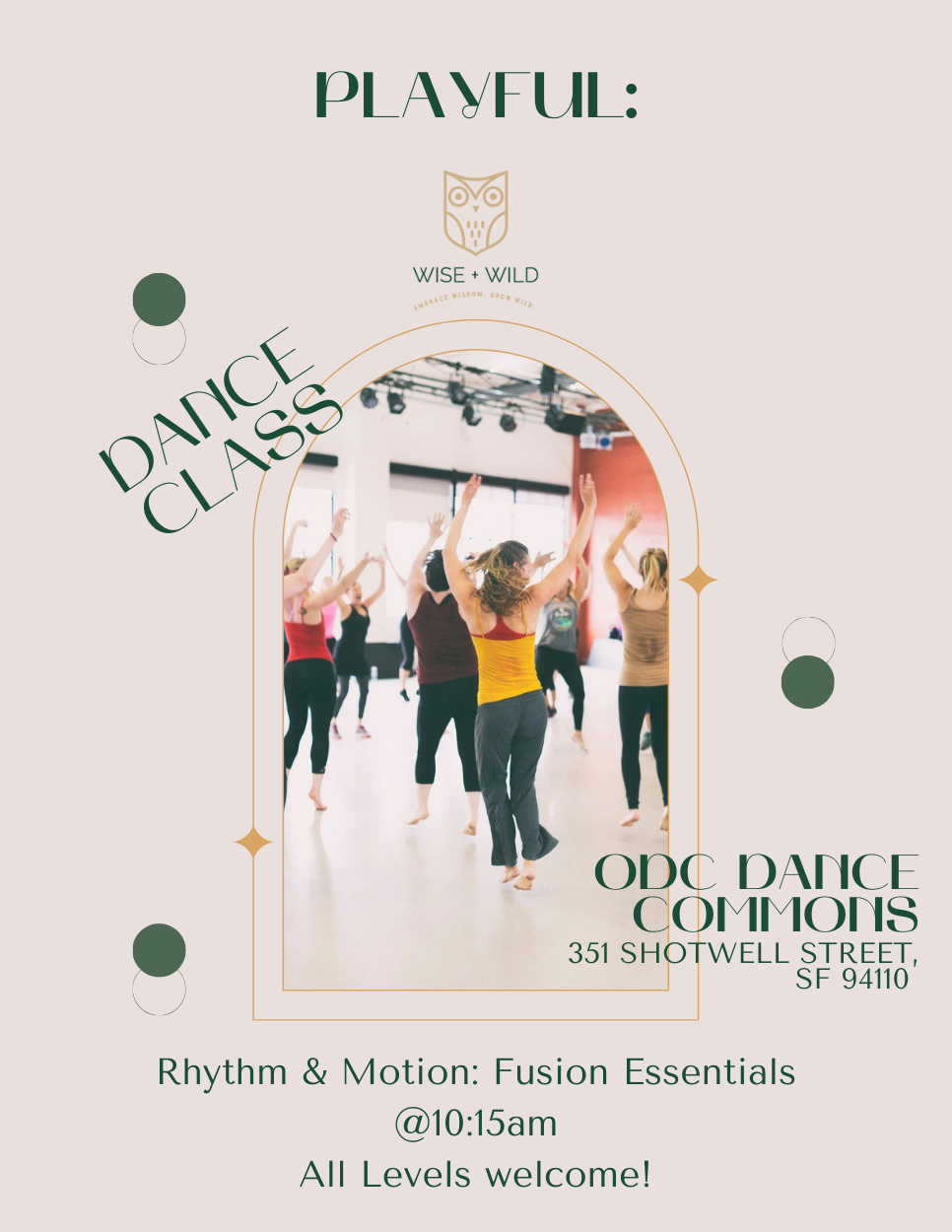Join us for a Rhythm & Motion: Fusion Essentials dance workout! All students of all levels and abilities are welcome. The class features a broad range of movement styles with choreography inspired by popular music from around the globe. The experience is low-pressure, joyful, full-bodied and sweaty. Class is 1 hour & 15 minutes. After class bite is 60-90 minutes (optional). Price is $12 for first-time ODC students/ $22 for returning students. Get your dance party on!
