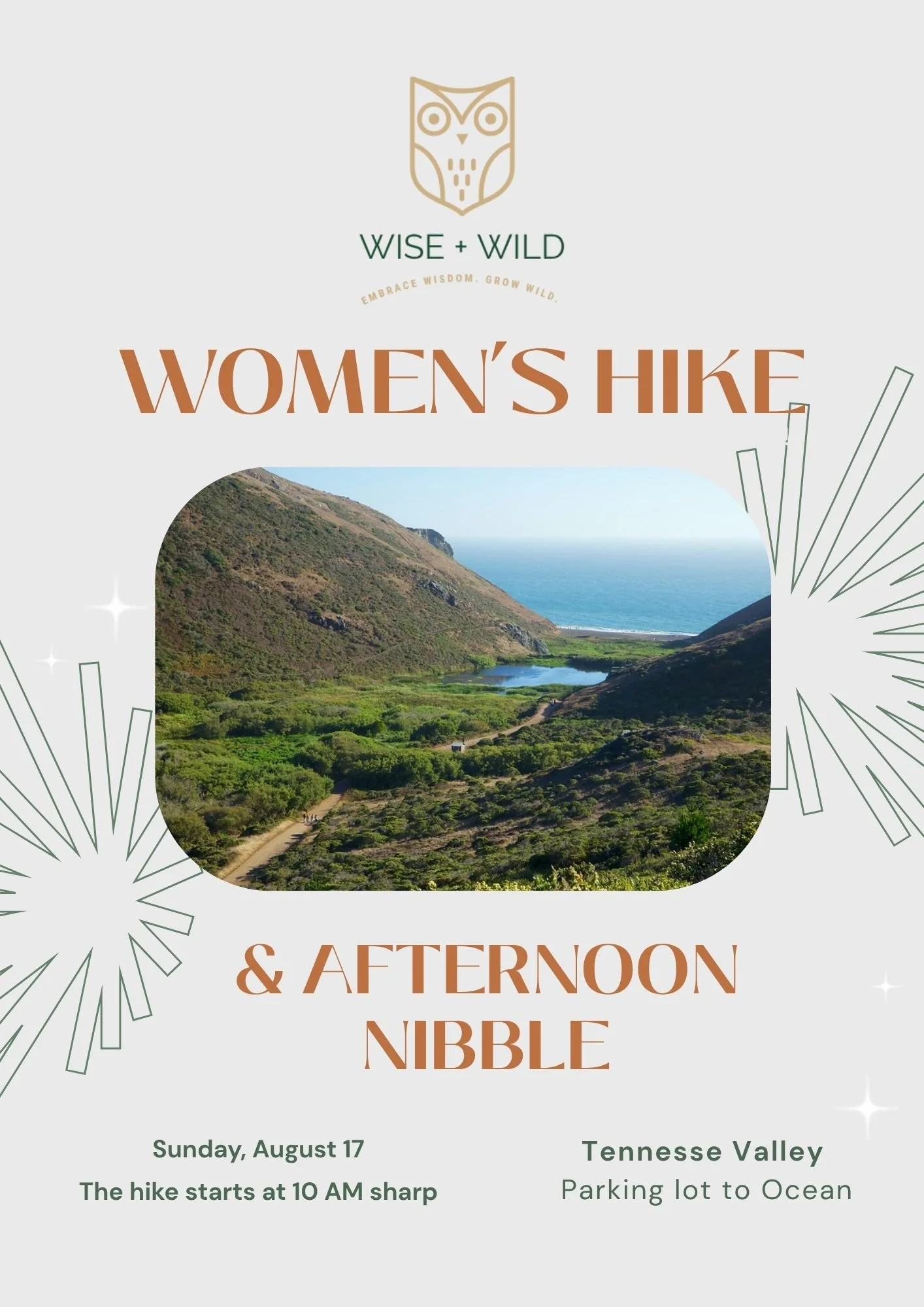 For this experience we’ll go for a simple hike along the Tennessee Valley Trail - to and from the beach (3.5 miles). On our journey we’ll get to know one another and enjoy all the natural beauty. After the hike we’ll enjoy a nibble at the Mill Valley Lumberyard. Hike is 2 hours. Afternoon bite is 60-90 minutes (optional). Walk, Talk and be Grateful!