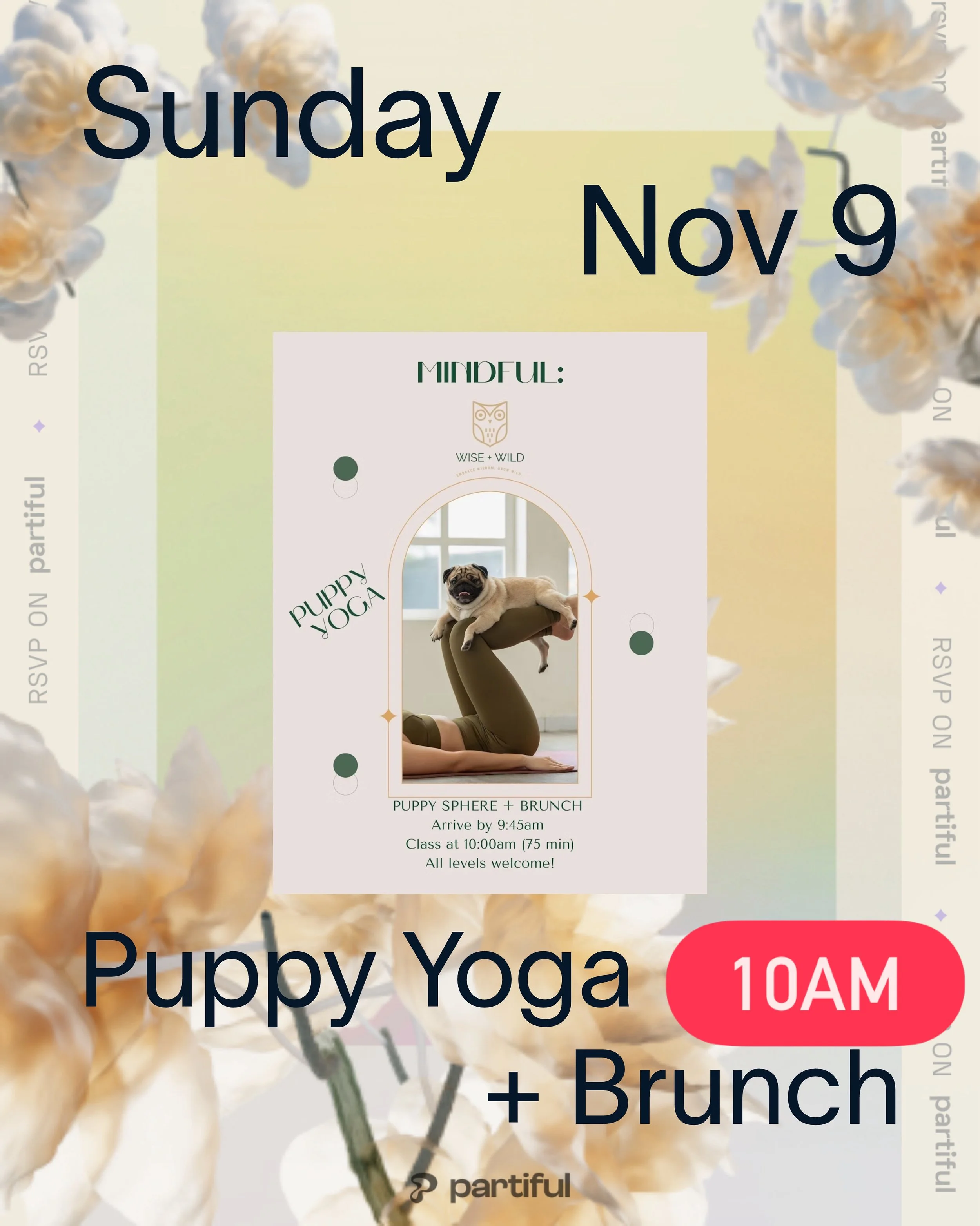 Find your flow, calm your mind, and fill your heart with joy during a one-of-a-kind Puppy Yoga session at Puppy Sphere. This class blends the grounding benefits of yoga with the lighthearted energy of playful puppies. Guided through gentle, beginner-friendly movements, you’ll stretch, breathe, and release stress—while curious pups roam freely, bringing unexpected smiles and sweet interruptions to your practice. Think of it as mindfulness with a wagging tail: a chance to reconnect with your body, boost your mood, and share laughter in community. Whether you’re new to yoga or deep in your practice, this unique wellness experience is designed to leave you feeling lighter, happier, and a little more playful yourself. Class is $52 and includes 45-min yoga w/ puppies, 30-min chill time with puppies, wellness drink cart and yoga mat.